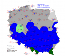 Strefa opadów śniegu utrzymuje się nad województwami południowym, a także częściowo w centrum i na wschodzie kraju. Miejscami są to opady o natężeniu umiarkowanym (aktualnie we Wrocławiu, Jeleniej Górze, Kłodzku, Kielcach, Lublinie-Radawcu, Rzeszowie-Jasionce), a na stacji w Opolu nawet silnym i tam w okresie od 22:00 do 01:00 spadło najwięcej śniegu - 3 cm. W najbliższym czasie strefa opadów śniegu powoli przemieszczać się będzie na północ. Prognozowany jest również wzrost natężenia opadów, a przez to też tempo przyrostu pokrywy śnieżnej. Opady śniegu miejscami (zwłaszcza w pasie od Dolnego Śląska i Opolszczyzny po Ziemię Świętokrzyską i pogranicze Lubelszczyzny i Podkarpacia) będą o natężeniu umiarkowanym, okresami silnym, powodując przyrost pokrywy śnieżnej o około 5-8 cm/3 godz.