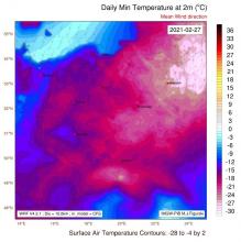 W drugiej dekadzie lutego zarówno model IMGW-TWS oraz WRF-CFS prognozują niższe wartości temperatury minimalnej w północno-wschodniej części Polski oraz na terenach górskich. Natomiast kolejny mroźny okres od 25 do 28.02.2021, przedstawiony na Rys. 5, wg modelu WRF-CFS przewiduje występowanie minimalnej temperatury powietrza do około -20°C na zdecydowanie większym obszarze Polski. A nawet w okolicach Białegostoku może osiągnąć wartość -28°C. Jedynie na północnym-zachodzie i zachodzie kraju minimalna temperatura powietrza może oscylować wokół -5°C. Wydaje się to nieprawdopodobne natomiast należy mieć na uwadze, że różnica temperatury pomiędzy biegunem zimna w Suwałkach i biegunem ciepła we Wrocławiu nie raz już potrafiła wynosić kilkanaście stopni, natomiast przedstawiona prawdopodobna sytuacja jest wynikiem modelu matematycznego, który próbuje opisać i przewidzieć rozwój zjawisk fizycznych zachodzących w atmosferze.