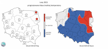 W odniesieniu do wyników modelu TWS (prognoza z 25.01.2021 r.), dla pierwszych 10 dni lutego (1-10.02.2021) na południu Polski przewiduje się występowanie minimalnej temperatury powietrza skrajnie od -15°C do -5°C w szczytowych partiach górskich (Kasprowy Wierch, Śnieżka), na południowym wschodzie (Komańcza od -12°C do 1°C) oraz na wschodzie i północnym-wschodzie kraju przez przeważnie od -10°C do 2°C na Podkarpaciu po wartości od -13°C do 0°C na Suwalszczyźnie. Podobnie w Polsce Centralnej minimalna temperatura powietrza może występować przeważnie od -10°C do 2°C. Na zachodzie kraju minimalna temperatura powietrza może się wahać na ogół od -7°C do 3°C (od Wielunia po Szczecin), natomiast w części północnej możemy się spodziewać występowania minimalnej temperatury powietrza w przedziale od -6°C do 4°C. Z kolei maksymalna temperatura powietrza na przeważającej powierzchni kraju może się wahać przeważnie od -2°C nawet do 10°C. Niższą maksymalną temperaturę powietrza powinniśmy odnotować w górach (Kasprowy Wierch od -8°C do 0°C i Śnieżka od -7°C do 2°C) oraz w północno-wschodniej części kraju (Suwałki od -6°C do 6°C).