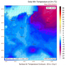 Wyniki eksperymentalnego modelu WRF-CFS (start prognozy z 25.01.2021 r. godz. 00:00) wskazują na znaczne ochłodzenie w pierwszej i trzeciej dekadzie lutego, przy czym przewidywane wartości temperatury powietrza są wyraźnie niższe od prognozowanych przez model IMGW-TWS. Okres od 03 do 06.02 przewidywany jest jako najchłodniejszy w pierwszej dekadzie lutego (Rys. 3).